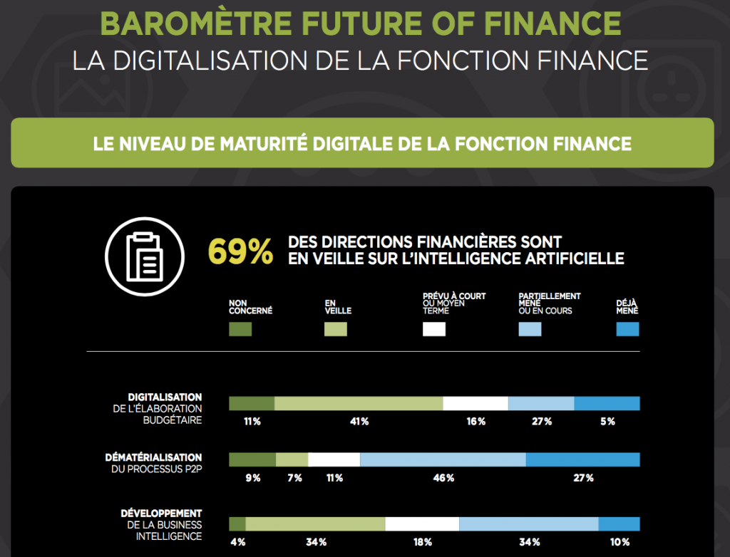 Si l’intelligence artificielle et la blockchain sont encore très peu utilisées (1 % de mise en œuvre de l’IA, 5 % pour la blockchain), les attentes envers ces technologies sont très élevées. En effet, 69 % des directions financières sont en veille sur l’IA et 50 % sur les apports que pourrait avoir la blockchain en matière de sécurisation des transactions.